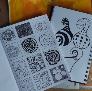I filled a page with these doodles, and my brain started firing off ideas about how I might use them elsewhere, and that is where I wanted to go with my art today, just playing in my sketchbook, and letting the ideas start flowing.