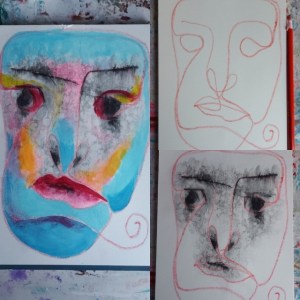 I grabbed a red peel off chinagraph pencil, something I rarely use, and used my non-dominant hand to create a face. Next, a trusty favourite – my Stabilo All in black with my waterbottle. I made a discovery about the way this combination works togather that I really like. The All pencil only bleeds within the confines of the chinagraph line. Obvious if you think about it, the waxiness of the red pencil acts as a resist.