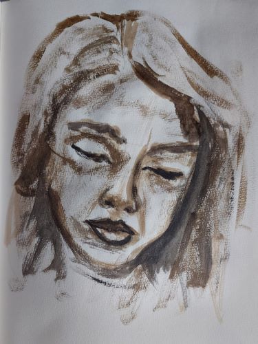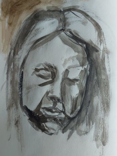 I spent today playing with a reference photo that I am going to use for a mixed media piece. I was using my cheapie A4 sketchbook and some watered down acrylic and a round brush, and sketching in the face. I’m not trying for a likeness, but I want to get the feel for the face before I start with the more expensive paper I purchased for this project.