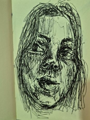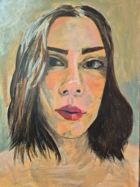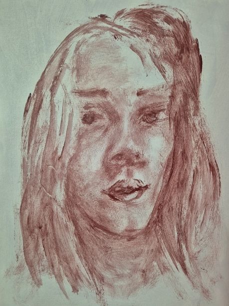The way I have engaged with this course is not linear like the week-to-week dropping of a class might encourage. For example today I have returned to the portrait reference provided in the first class of the year, and painted it again, using my process I have developed for myself with my loose caput mortuum acrylic and my Shitty Brushes.