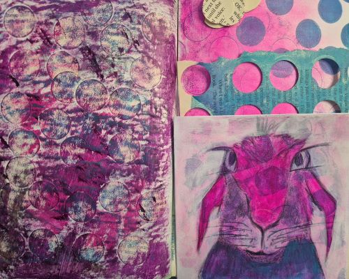I got a circle punch yesterday, and I broke it in today, punching holes in some old book pages. The image on the left shows some of the circles, and also shows some of them collaged onto a junk journal page. I really like the effect. The leftover paper with holes makes fun stencils for the gel plate, and you can see a bit of that in the left hand photo too.
