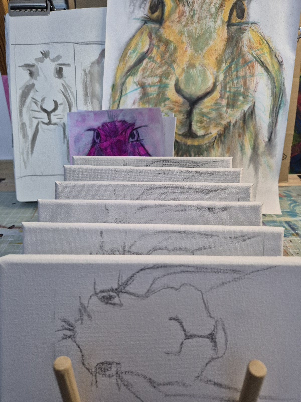 I used all six of these canvases for hares, but the sketchbook spread, mostly obscured behind the large hare, has three other ideas, so I might make a series.