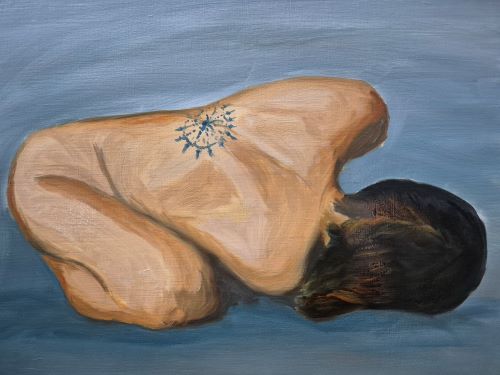 It is my response to a Let’s Face It class with Misty Segura-Bowers, but I chose my own reference, and image from Dinoopis on Instagram. The prompt for the class was “paint a figure from behind” and so I stretched that just a little 😉