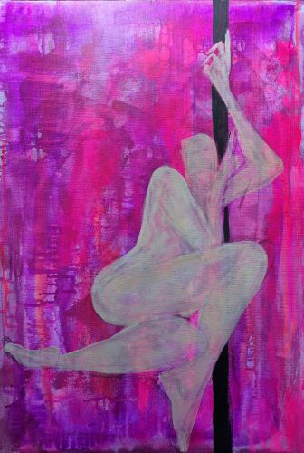 After the oil painting hour, I got started on a large canvas board, and some wild colours for a background. It’s large. I got the figure sketched on, and then a first coat blocking in the figure. The reference is one of Dinoopis’ Shapes, and I have intentionally exaggerated it in places.
