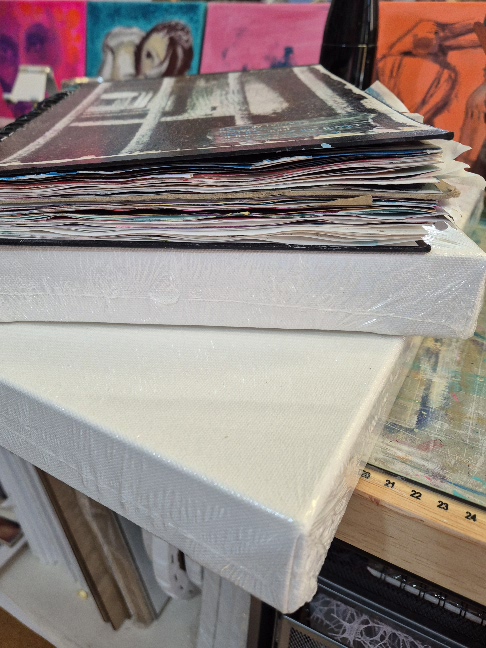 The sketchbook is sitting on the two new canvases that arrived today in my Jackson’s box. Yes, I have a lot of blank canvases and don’t really need more, but the ones I have are almost all narrow depth. I wanted a couple of gallery canvases for potential submissions to open calls so I don’t have to worry about framing.