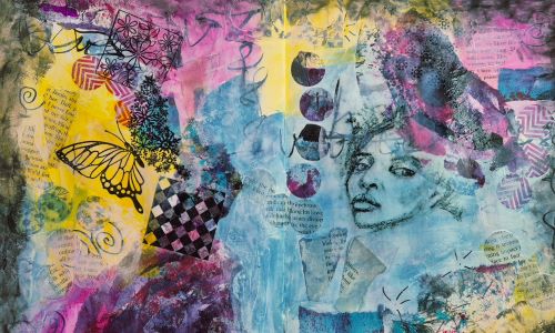 I do like how this spread looks, with one of my portrait drawings collaged in, especially after all the energy I have put into getting the images to transfer in a way that makes me happy.
