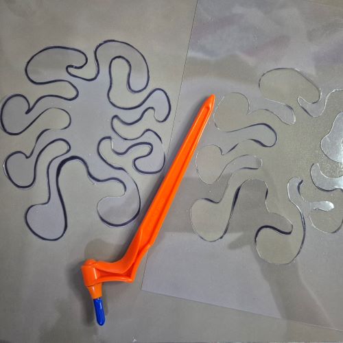 The blade is super sharp, and I managed not to slice a finger off, so that’s a good start. I just drew a random, silly shape on the acetate with a Sharpie, then cut around it. I ended up with a stencil and a mask, so double the fun. I’m really happy with them, even though my cutting wasn’t perfection, I guess there’s a bit of a learning curve…