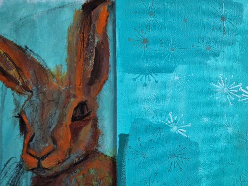 There was a lot of playing and testing and whatnot went on today, but it’s not exactly coherent or photogenic, so here’s a snippet of the canvas board I was testing ideas on next to the hare I painted yesterday.