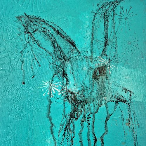 Most of today’s output was canvas prep and backgrounds, but I decided at the last minute to use the small canvas board I was using yesterday for testing ideas, and stick a hare on it. I say stick a hare on it, I sketched it on and then dislodged most of it off with the spray bottle. Stabilo All and water makes me happy.