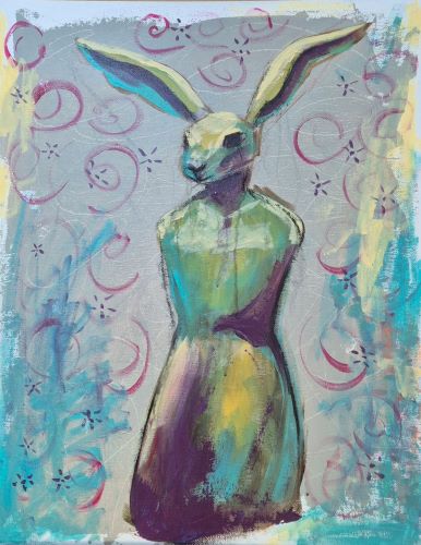 Hares have been kicking around in my sketchbooks and paintings, and there was this one sketch that I did when I was imagining a doll that I keep flipping back to. I used that sketch as the jumping off point for the canvas, and this is where I ended up.