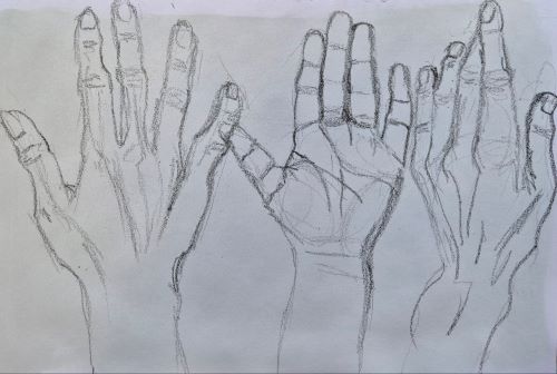 Continuing with the theme of hands in my extremely inexpensive A3 sketchbook, I am mixing up the materials a bit. I pulled out a chinagraph pencil, and did some studies with that. I’m not huge on using erasers even if I’m using graphite, but I very much like things like chinagraph pencils, because all your choices are in the history of the drawing.