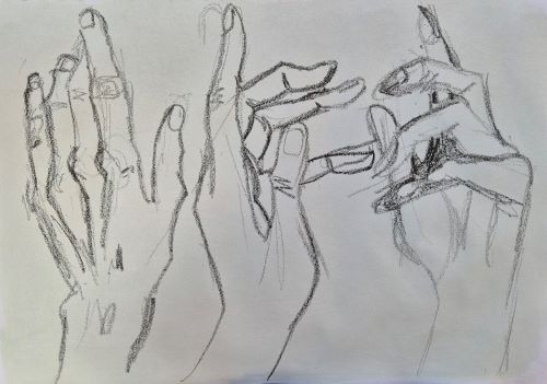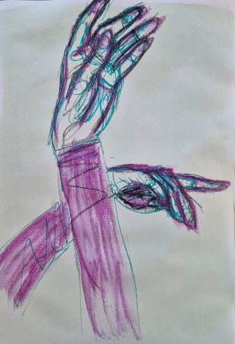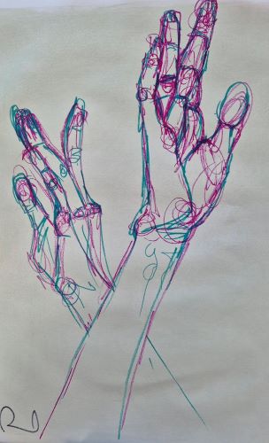 More fun with hands today. I pulled out a bunch of art supplies that I haven’t used in a while, and mixed things up a bit. There’s a chinagraph pencil, a gel pen, woodies, sharpies, watercolour pencils, neocolor IIs.