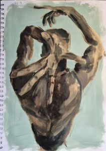 I sketched and painted back of the head views today, and then finished up with this one incorporating the back view and the hands theme. A real beezer of complexity, this one, which I made even more difficult for myself with my choice of brush.