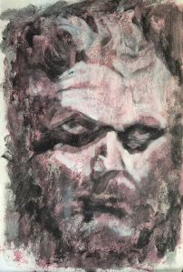 Starting with some warm-up play in a sketchbook on a page that had some acrylic paint from a previous session as a ground, I played with this high-contrast reference and some charcoal powder.