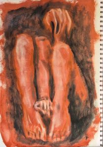 Starting with a ground in Indian Red acrylic, I then used a very similar colour in the pan pastel to smudge in the basic shapes. This is very forgiving, if you are itching to try figures but not quite getting to the page.