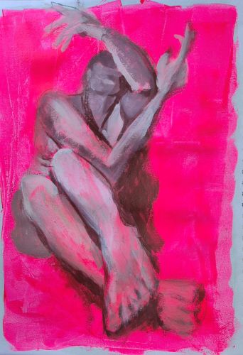 I have this tube of fluorescent pink acrylic that is almost finished, and it’s a few years old, so I’m on a mission to finish the tube. I smeared it on this sketchbook page, where it is less likely to be a fugitive, but it makes working my values kind of interesting because it is actually a very light value, and if I was thinking about it, which I wasn’t, I could have left it peaking through at the highlights. This is the first go at a new pose, so I’m not too fussed. I like the prominent foot, I want to rework the arms.