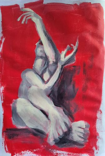 This is a really fun, complex pose that really forces me to look at shapes and shadows, instead of trying to draw/paint a human. This is at the blocking-in stage, just using a larger brush make gestural marks to get the basic framework. In the process I decided that I definitely don’t like a certain brand of paint for this kind of work. I like it for other things, but this type of painting, nope.