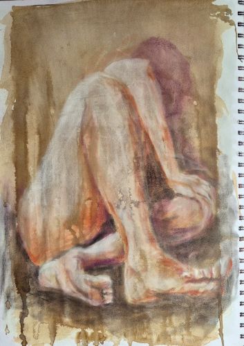 I had made this drippy background in my sketchbook yesterday, so I decided to try out the pan pastels on it. I put down some clear gesso to give a bit of tooth, and started off with the lightest values and a white pan pastel. I only own four colours in this medium, so a limited palette.