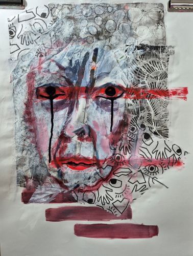 Then I went to make friends with my other art, as per Maggi’s instructions, and pulled up one of the abstract self-portraits from the other day. There was a lot of collaging over things that I hated, and more layers of paint and ink, and I like it more than what was there before.