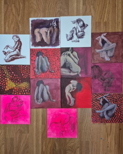 It’s also Day 14 of the 100 Day Project, and I have actually managed to paint fourteen canvases, which equates to one per day, but that’s not exactly how it has happened. None of these, above, are finished, and I’m enjoying what’s happening.