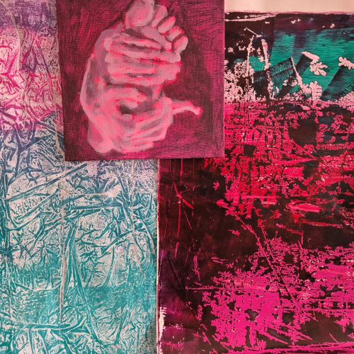 I’ve also been playing with my new 12×14″ gel plate and I am smitten. The larger size means a wider range of movement, and I’ve been having a lot of fun sweeping my brayers about. There’s a learning curve with getting the paper on the plate, especially tissue paper, but life without learning curves would be boring.